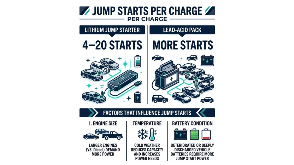 • Most lithium jump starters handle 4 to 20 starts per charge under ideal conditions.