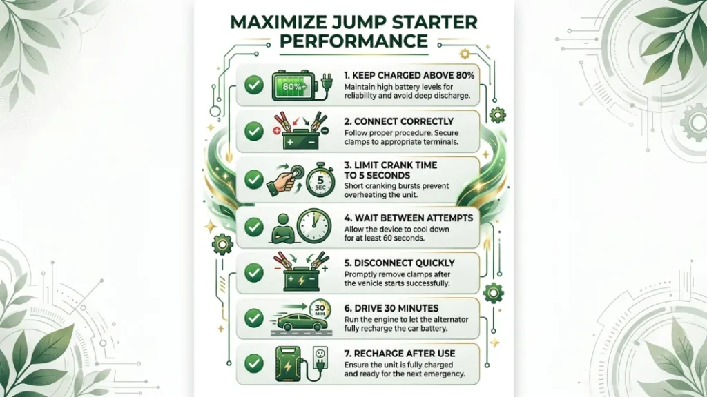 You can stretch your jump starter’s capacity with a few smart habits. None of these are complicated. They’re just things most people skip.